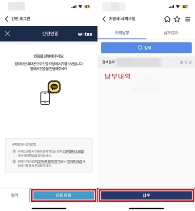 인증이 완료되면 납부해야 할 내역이 바로 나타나며 아래 납부버튼을 클릭하시면 납부를 하실 수 있습니다.