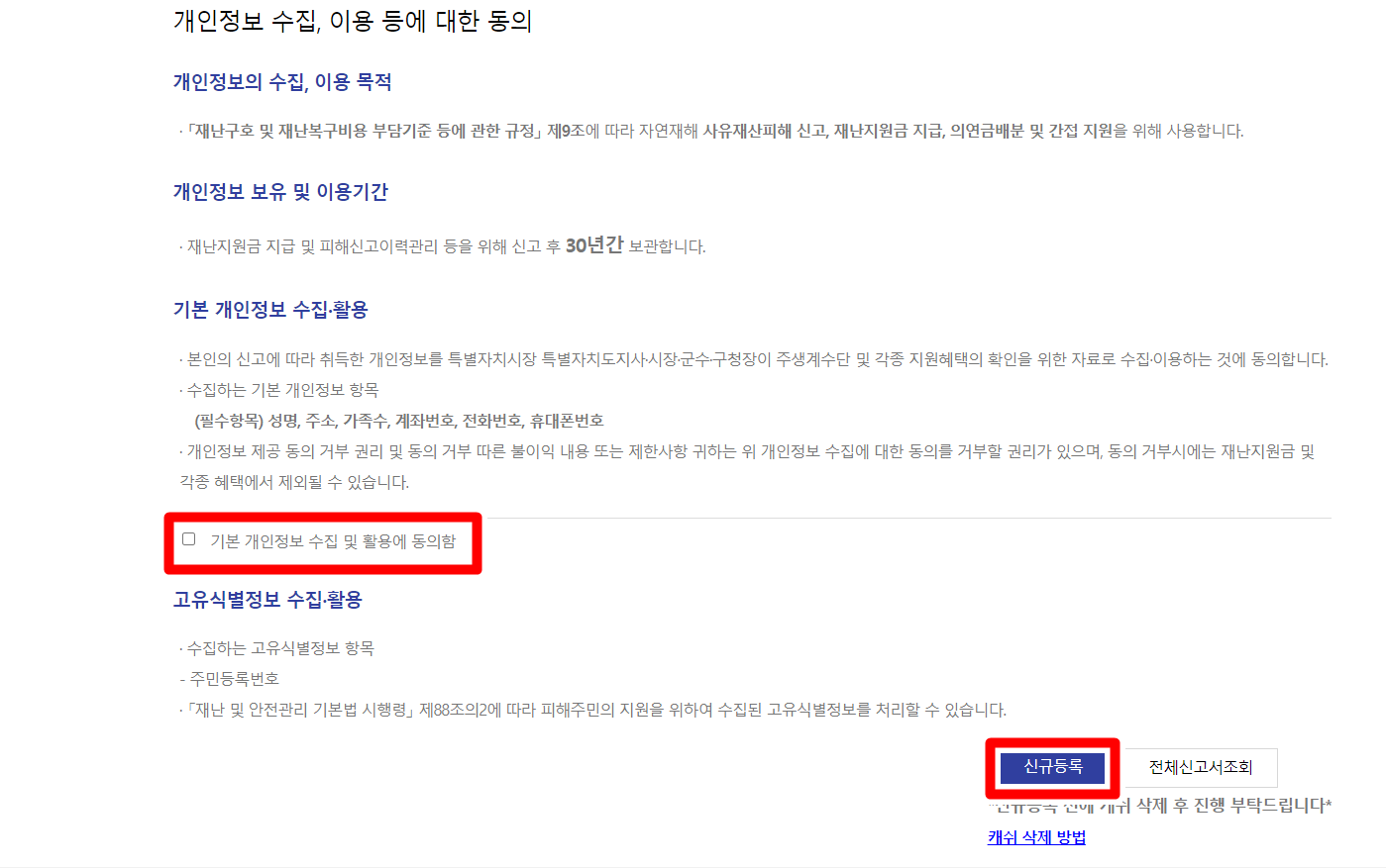 그리고 아래로 스크롤을 내리셔서 개인정보 수집 동의란에 체크하시고 아래 신규등록을 누르시면 됩니다.