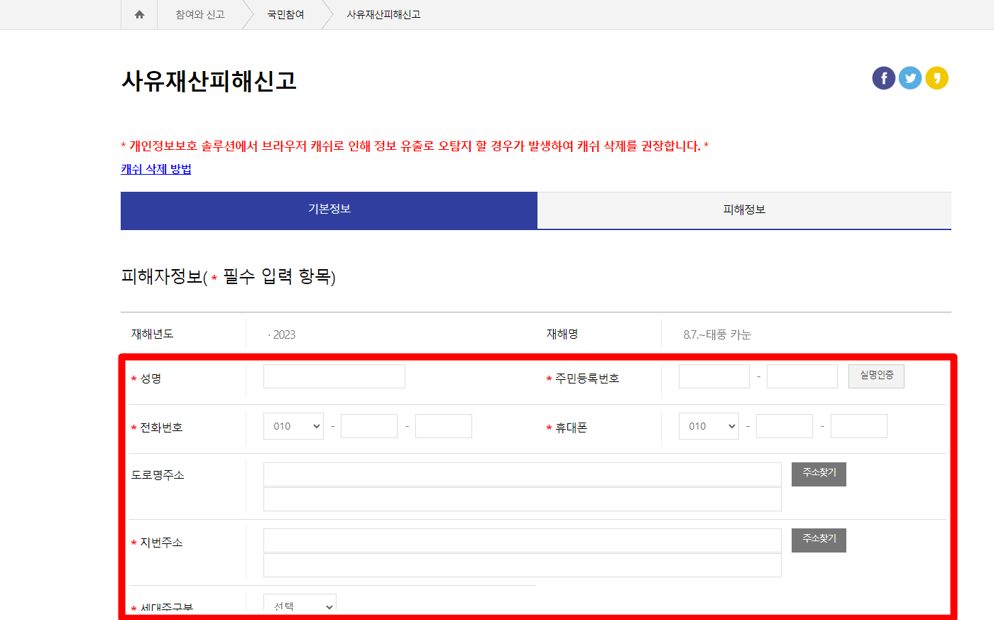 태풍에 피해를 입으셨다면 피해 현장사진을 꼭 찍어 두시길 바랍니다. 아래 링크를 통해 국민재난안전포털 사이트에 접속하셔서 순서에 따라 선택하시고 내용을 작성하시면 쉽게 신청하실 수 있습니다.