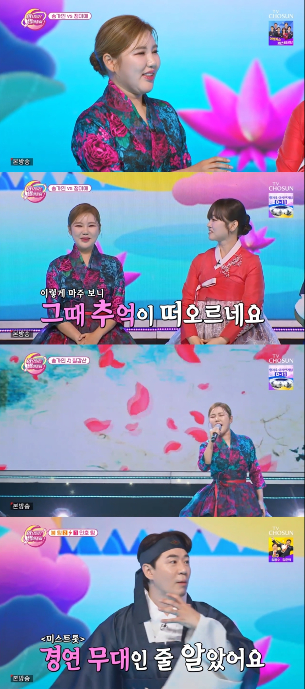 지난 12일 저녁에 방송된 TV조선 ‘화요일은 밤이 좋아’에서는 가수 송가인이 정미애와 약 4년 만에 다시 한번 무대를 같이 했습니다. 이는 두 사람이 ‘미스트롯’에서 선의의 경쟁을 벌였던 이후 처음으로 만나는 시간이었으며, 이 날 방송은 추석맞이 ‘효도합시다’ 특집으로 꾸며졌습니다.